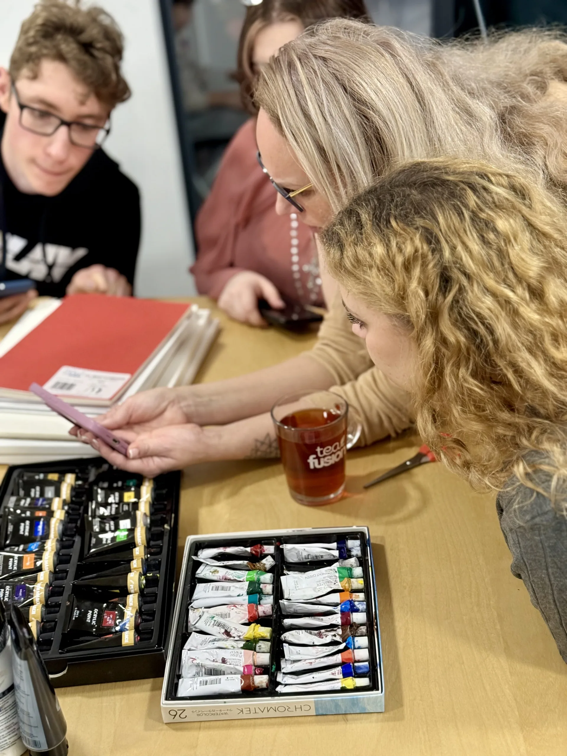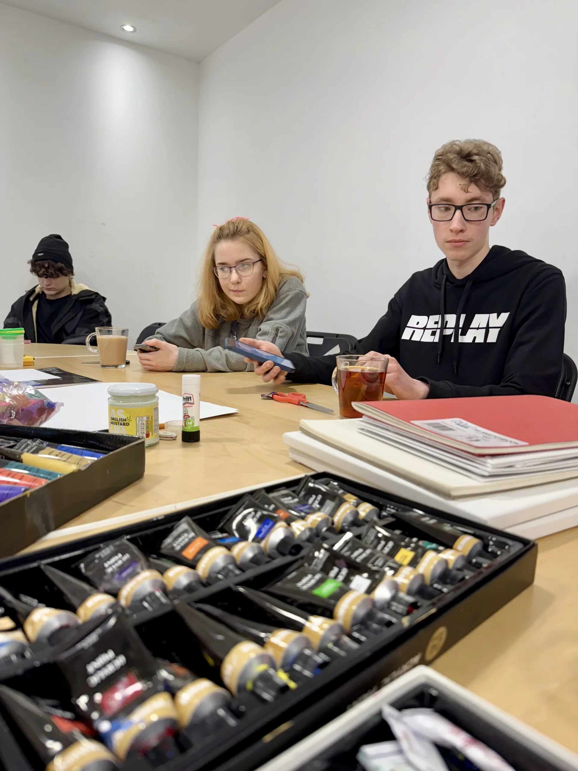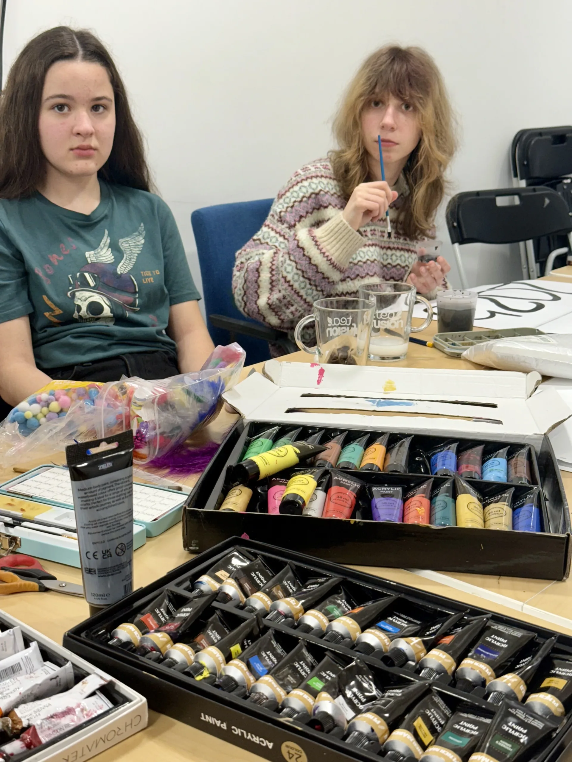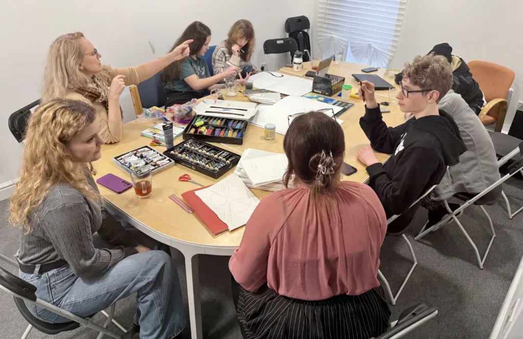 Once the ideas were collected, the young artists began developing sketches. The table soon filled with sketchbooks, pencils, rulers, acrylic paints, and colourful materials. Each participant contributed ideas and visual elements that could become part of the final poster.