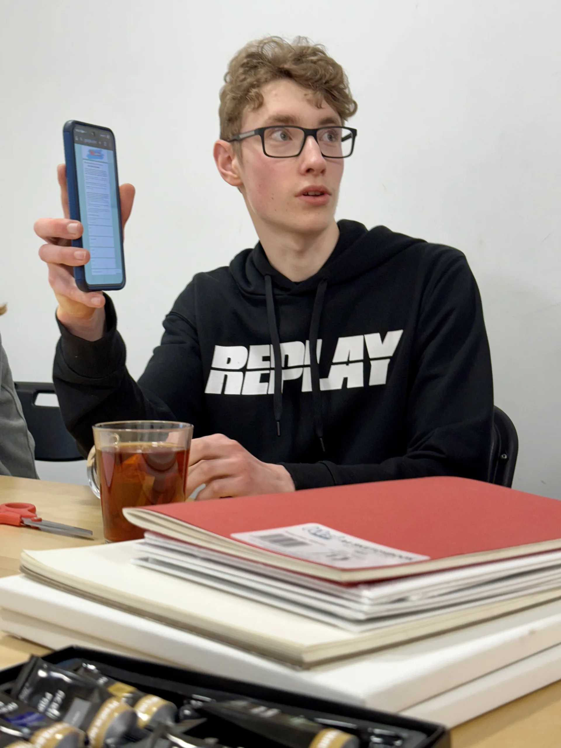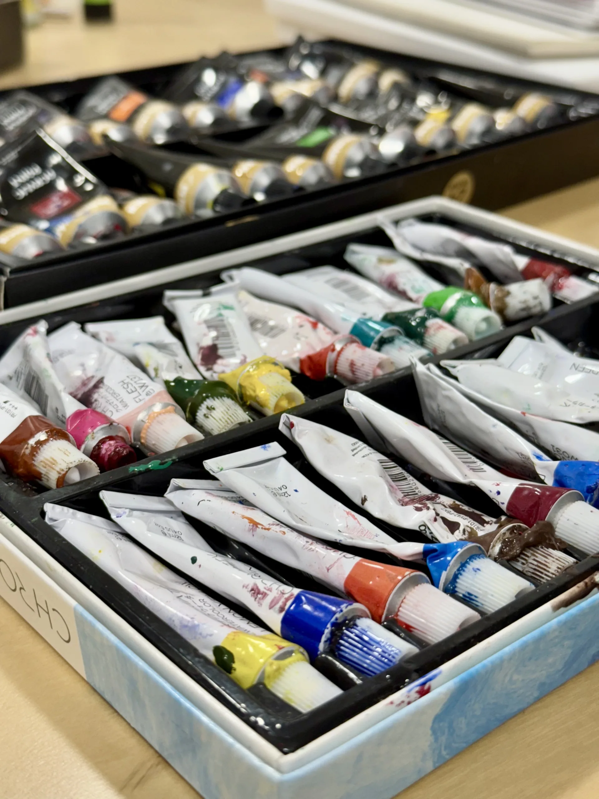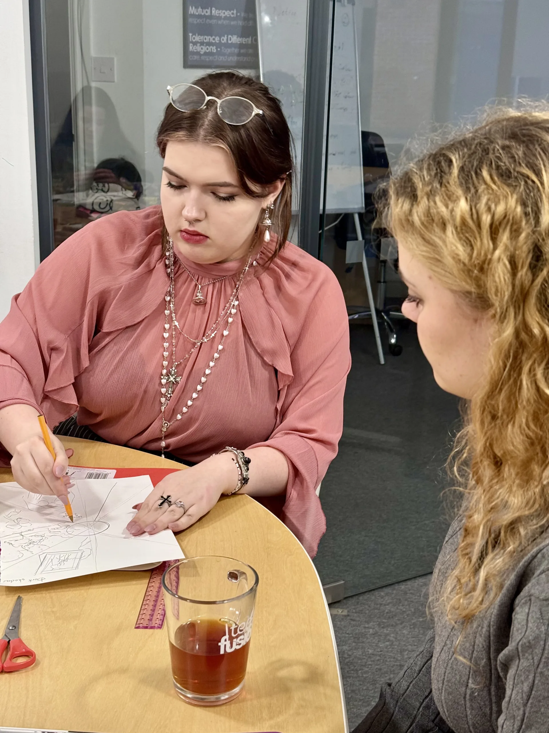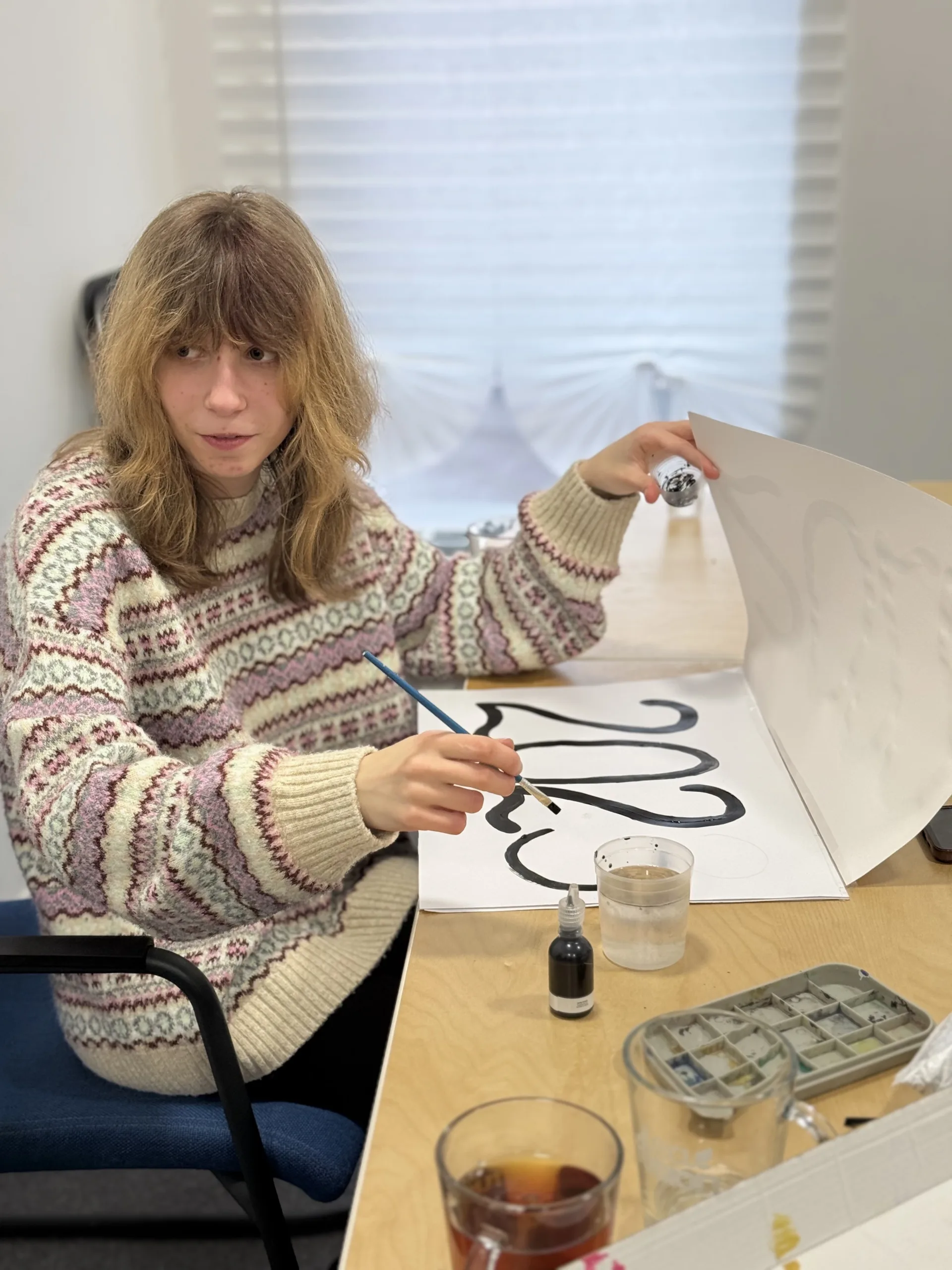 Once the ideas were collected, the young artists began developing sketches. The table soon filled with sketchbooks, pencils, rulers, acrylic paints, and colourful materials. Each participant contributed ideas and visual elements that could become part of the final poster.